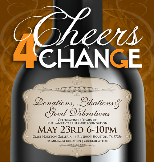 On Thursday, May 23rd, 2013, between the hours of 6pm and 10pm, join us at The Fanatical Change Foundation’s 2013 Cheers 4 Change: Donations, Libations & Good Vibrations at the Omni Houston Galleria in Houston, Texas to continue the mission of our charitable organization. Throughout the event, guests will enjoy live music, dancers, cocktails, hors d’oeuvres, auction of unique trips, and the company of individuals and local captains of business who desire to see a change in Houston and how charity works.